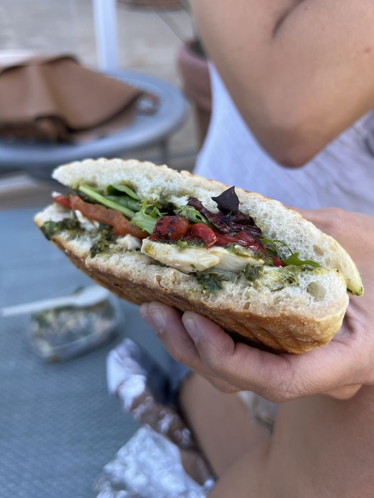 fresh mozzarella, marinated red peppers, basil pesto, mixed greens, balsamic glaze drizzle (600 cal) on panini-pressed ciabatta (260 cal)